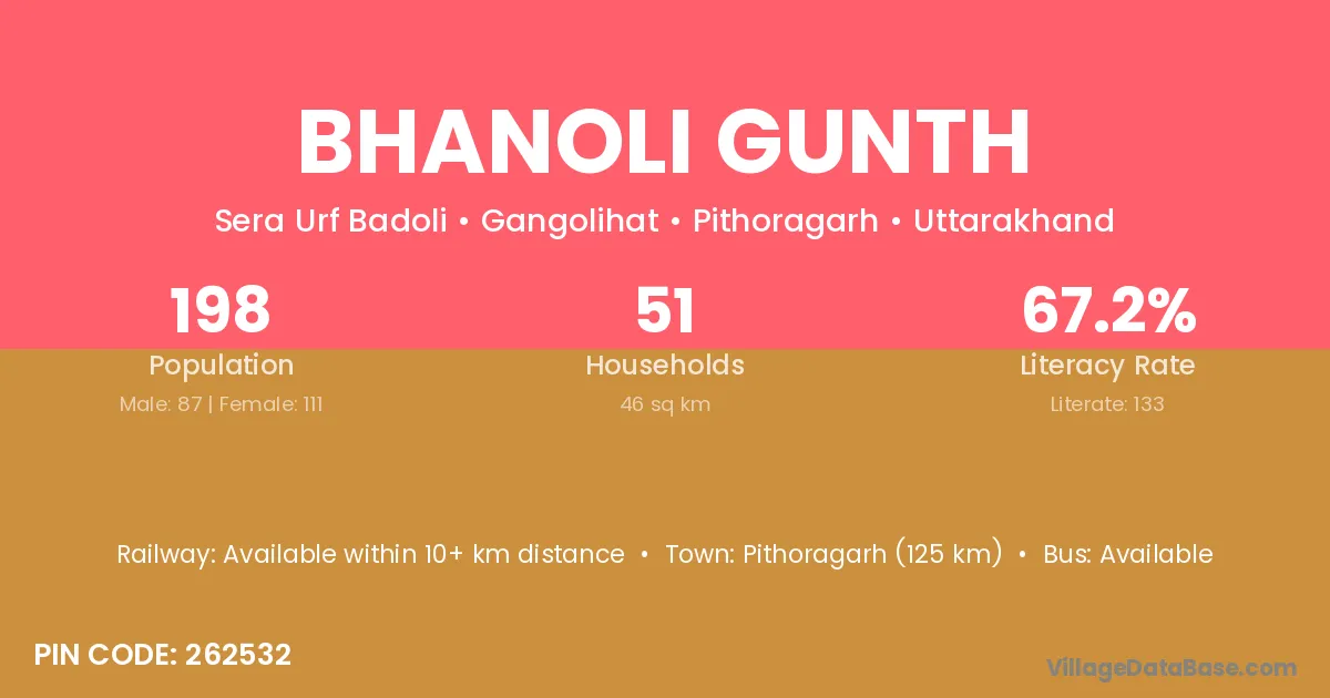 Pithoragarh (125 km) is the nearest town to Bhanoli Gunth village for major economic activities and is located approximately 125 km away.