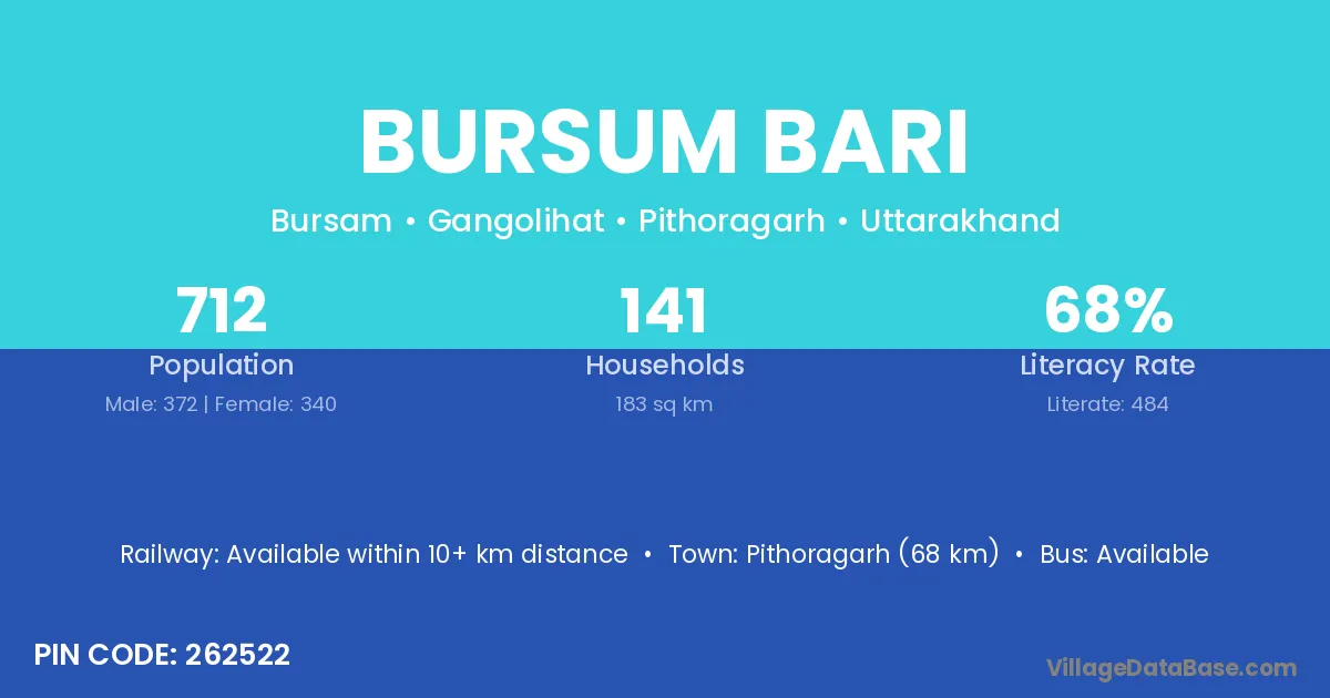 Pithoragarh (68 km) is the nearest town to Bursum Bari village for major economic activities and is located approximately 68 km away.