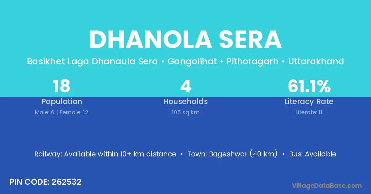 Bageshwar (40 km) is the nearest town to Dhanola Sera village for major economic activities and is located approximately 40 km away.