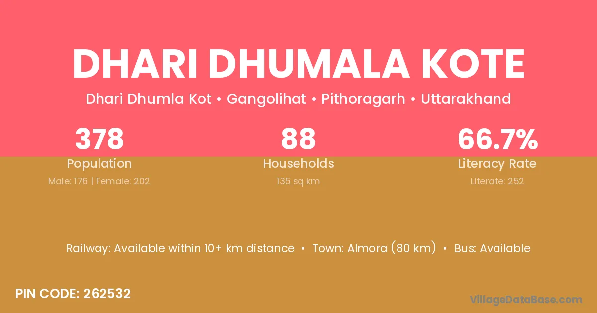 Almora (80 km) is the nearest town to Dhari Dhumala Kote village for major economic activities and is located approximately 80 km away.