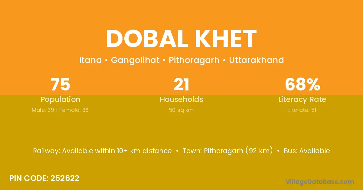 Pithoragarh (92 km) is the nearest town to Dobal Khet village for major economic activities and is located approximately 92 km away.