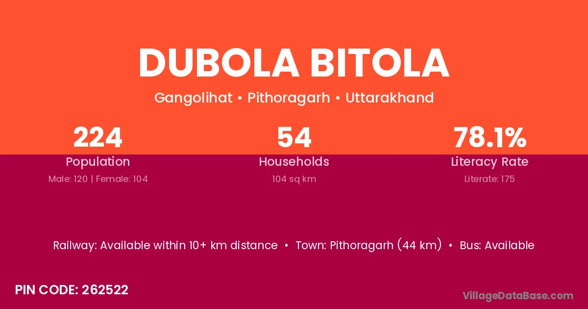 Pithoragarh (44 km) is the nearest town to Dubola Bitola village for major economic activities and is located approximately 44 km away.