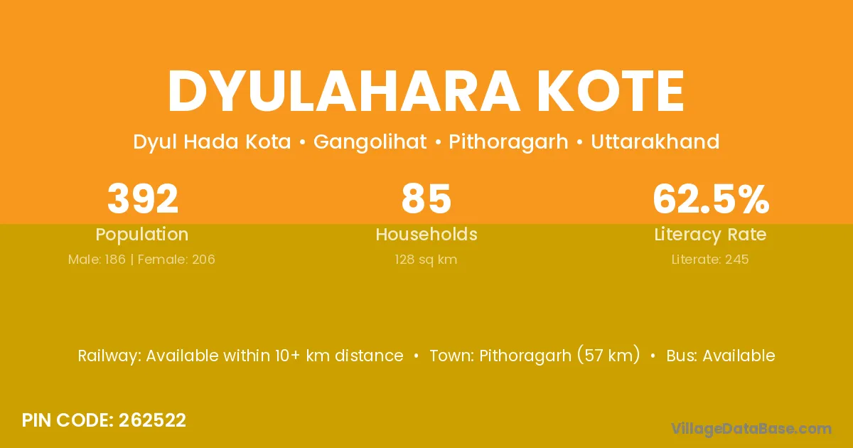 Pithoragarh (57 km) is the nearest town to Dyulahara Kote village for major economic activities and is located approximately 57 km away.