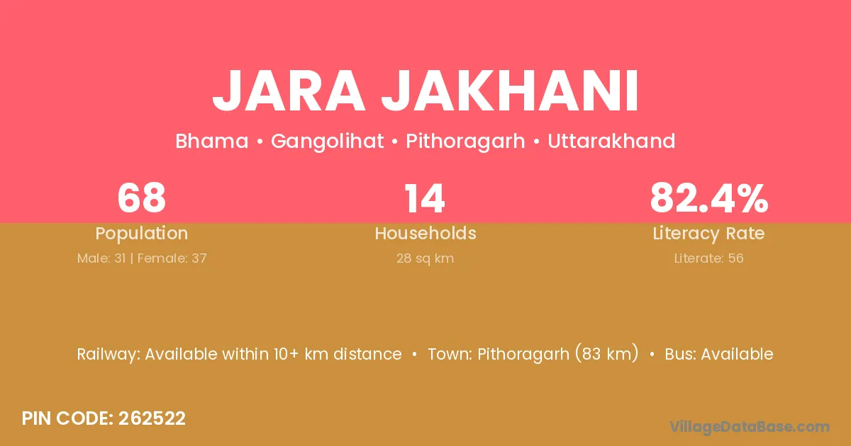 Pithoragarh (83 km) is the nearest town to Jara Jakhani village for major economic activities and is located approximately 83 km away.