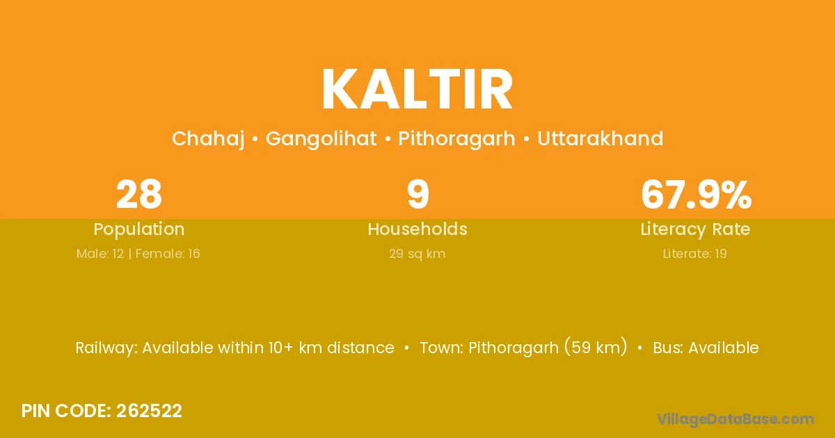 Pithoragarh (59 km) is the nearest town to Kaltir village for major economic activities and is located approximately 59 km away.
