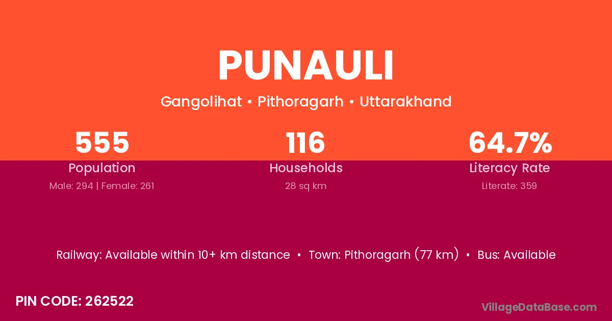 Pithoragarh (77 km) is the nearest town to Punauli village for major economic activities and is located approximately 77 km away.