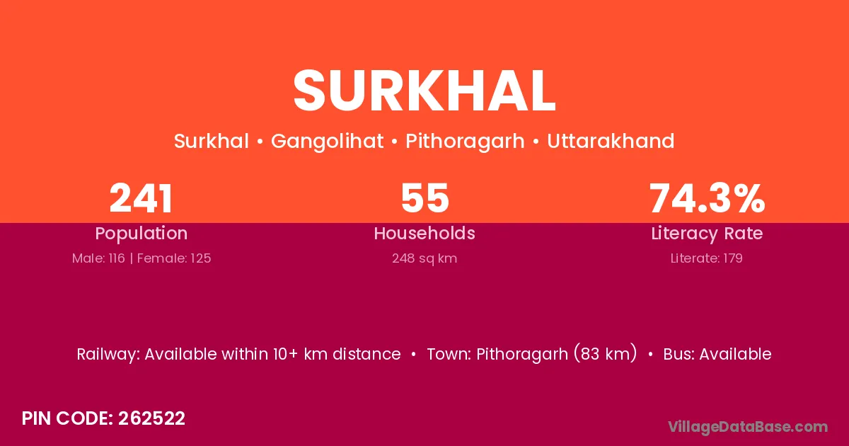 Surkhal village has a total population of 241 people, of which 116 are males and 125 are females.