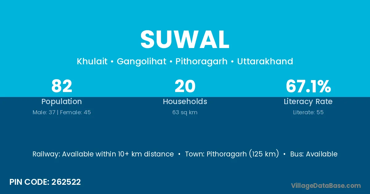 Pithoragarh (125 km) is the nearest town to Suwal village for major economic activities and is located approximately 125 km away.