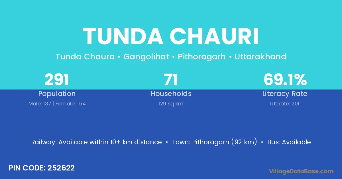 Pithoragarh (92 km) is the nearest town to Tunda Chauri village for major economic activities and is located approximately 92 km away.
