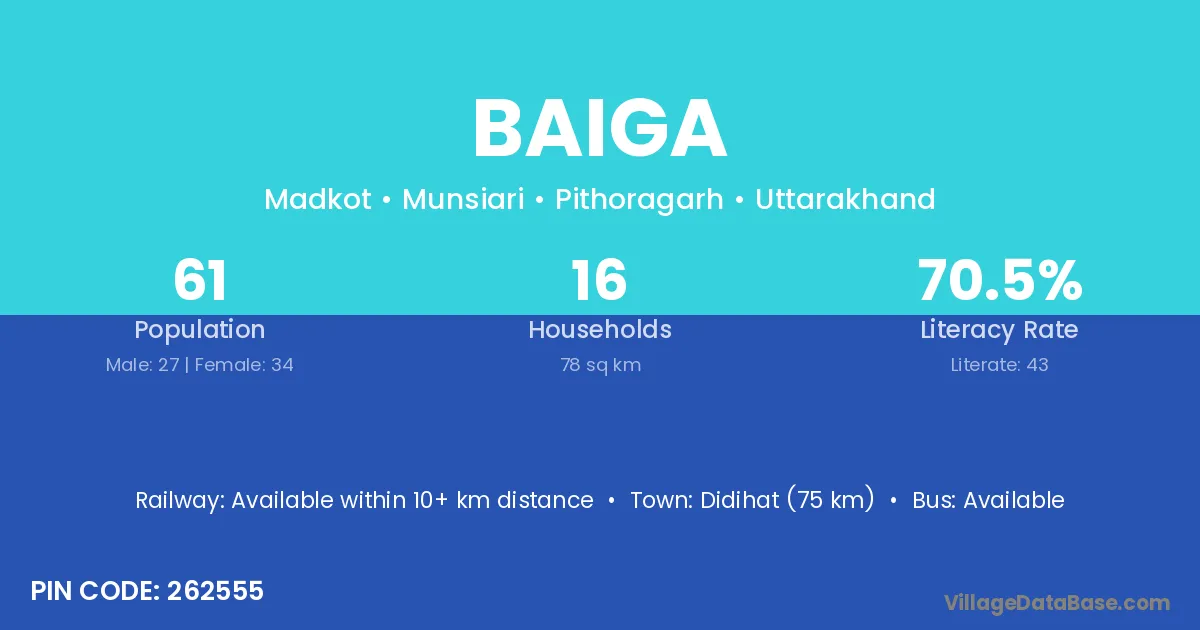 Didihat (75 km) is the nearest town to Baiga village for major economic activities and is located approximately 75 km away.