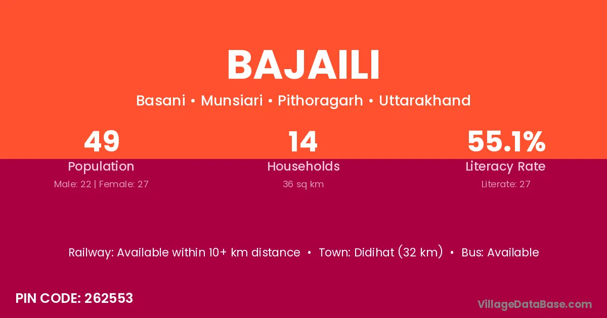 Didihat (32 km) is the nearest town to Bajaili village for major economic activities and is located approximately 32 km away.