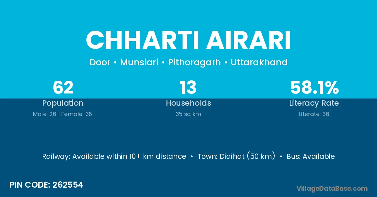Didihat (50 km) is the nearest town to Chharti Airari village for major economic activities and is located approximately 50 km away.