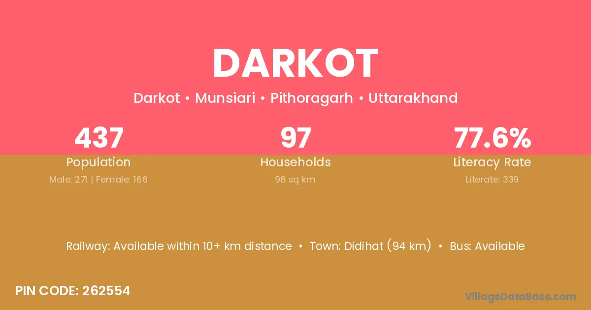 Didihat (94 km) is the nearest town to Darkot village for major economic activities and is located approximately 94 km away.
