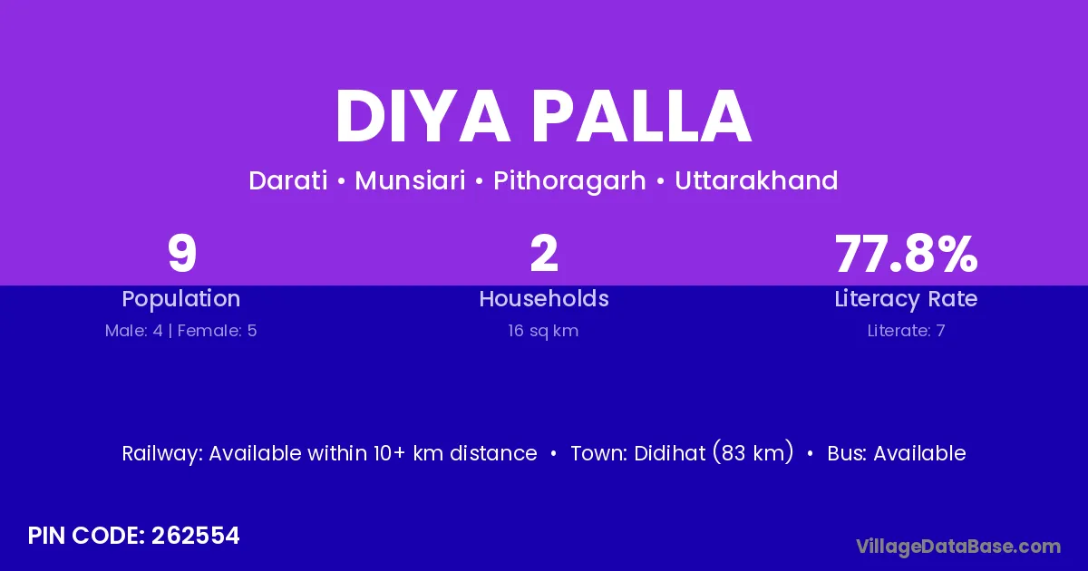 Didihat (83 km) is the nearest town to Diya Palla village for major economic activities and is located approximately 83 km away.