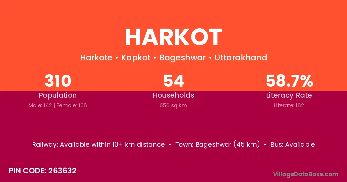 Didihat (96 km) is the nearest town to Harkot village for major economic activities and is located approximately 96 km away.
