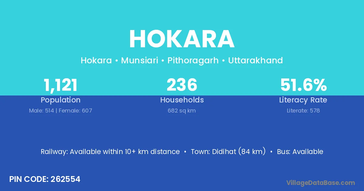 Didihat (84 km) is the nearest town to Hokara village for major economic activities and is located approximately 84 km away.