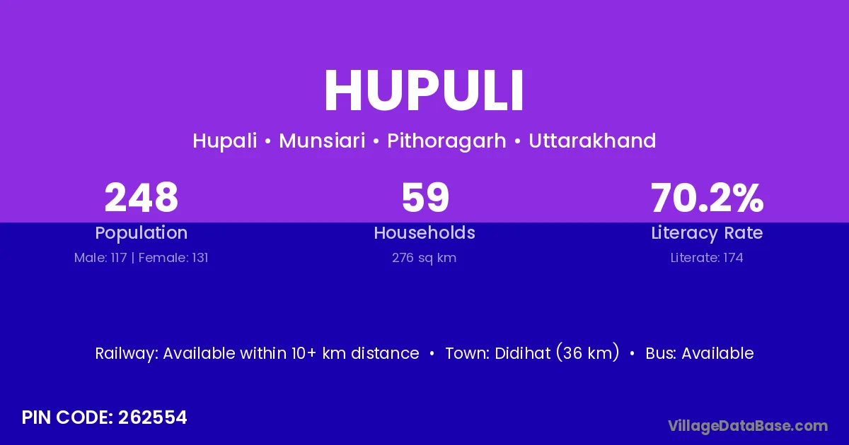 Didihat (36 km) is the nearest town to Hupuli village for major economic activities and is located approximately 36 km away.