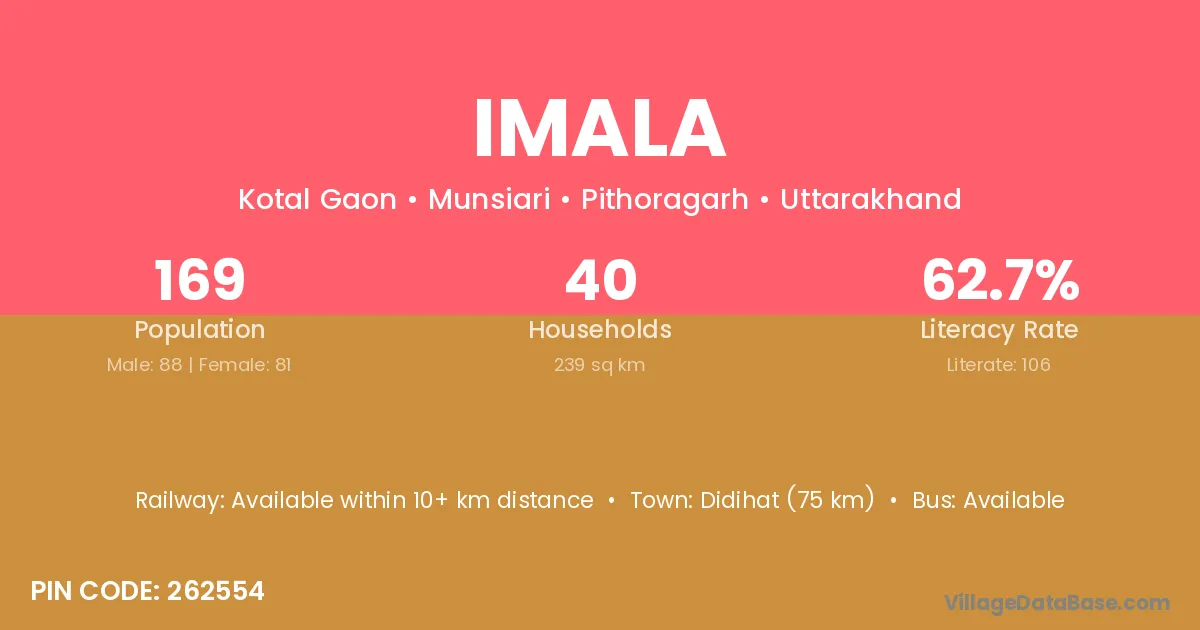 Didihat (75 km) is the nearest town to Imala village for major economic activities and is located approximately 75 km away.