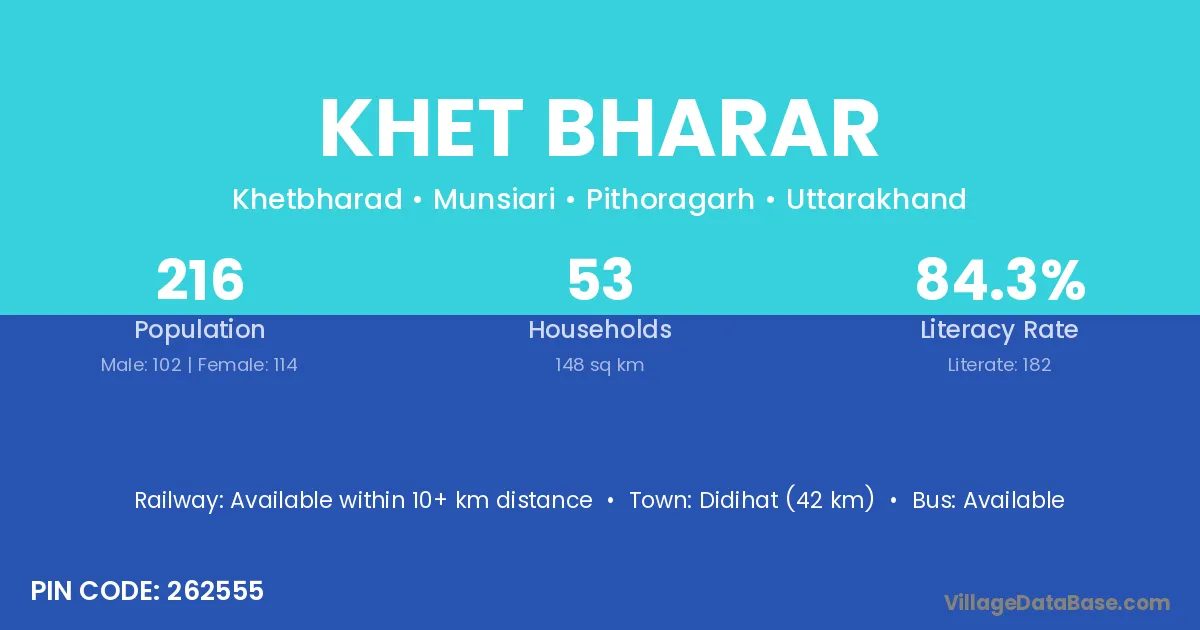 Didihat (42 km) is the nearest town to Khet Bharar village for major economic activities and is located approximately 42 km away.