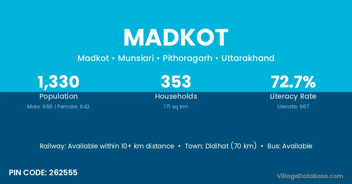 Didihat (70 km) is the nearest town to Madkot village for major economic activities and is located approximately 70 km away.