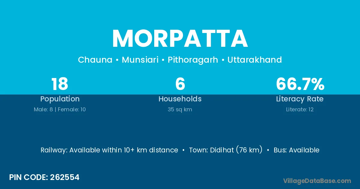 Didihat (76 km) is the nearest town to Morpatta village for major economic activities and is located approximately 76 km away.