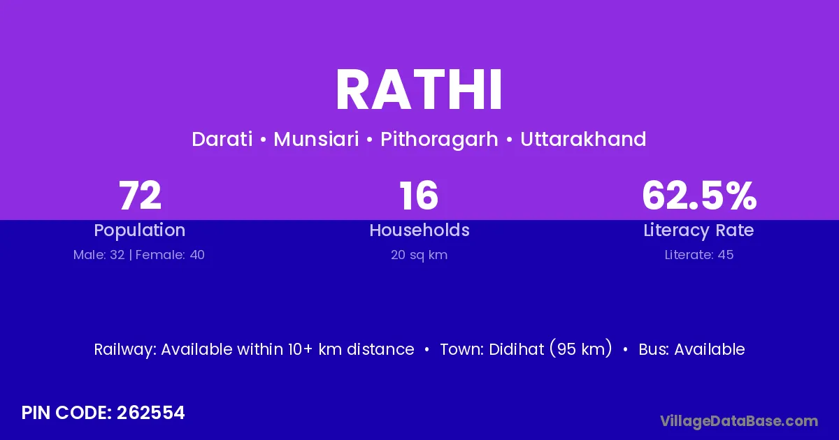 Didihat (95 km) is the nearest town to Rathi village for major economic activities and is located approximately 95 km away.