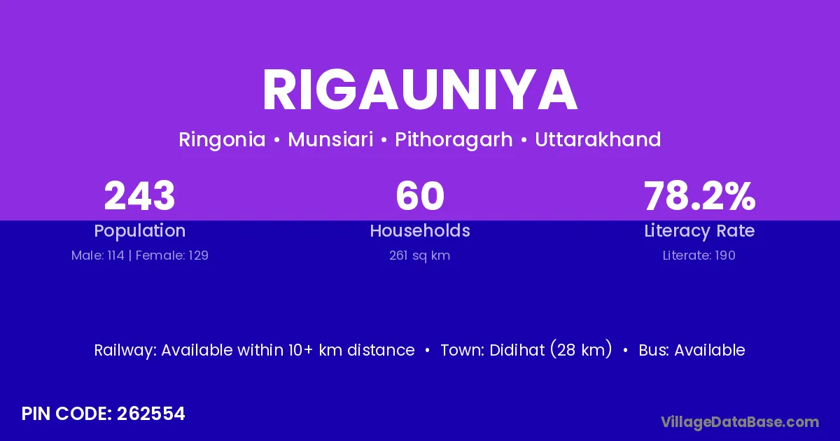 Didihat (28 km) is the nearest town to Rigauniya village for major economic activities and is located approximately 28 km away.