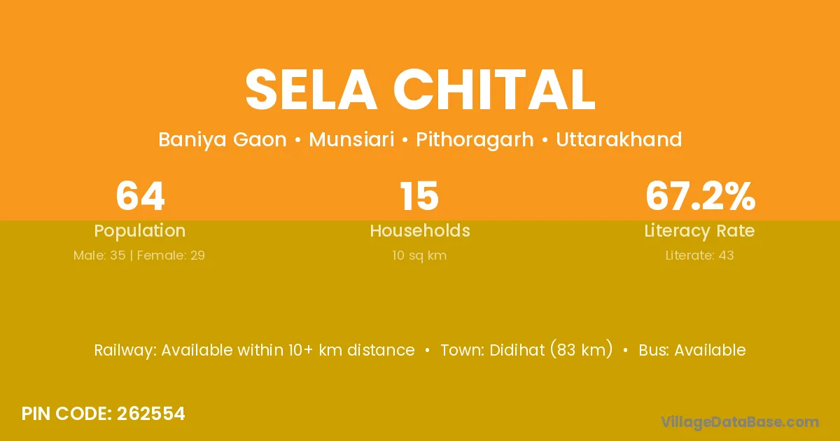 Didihat (83 km) is the nearest town to Sela Chital village for major economic activities and is located approximately 83 km away.