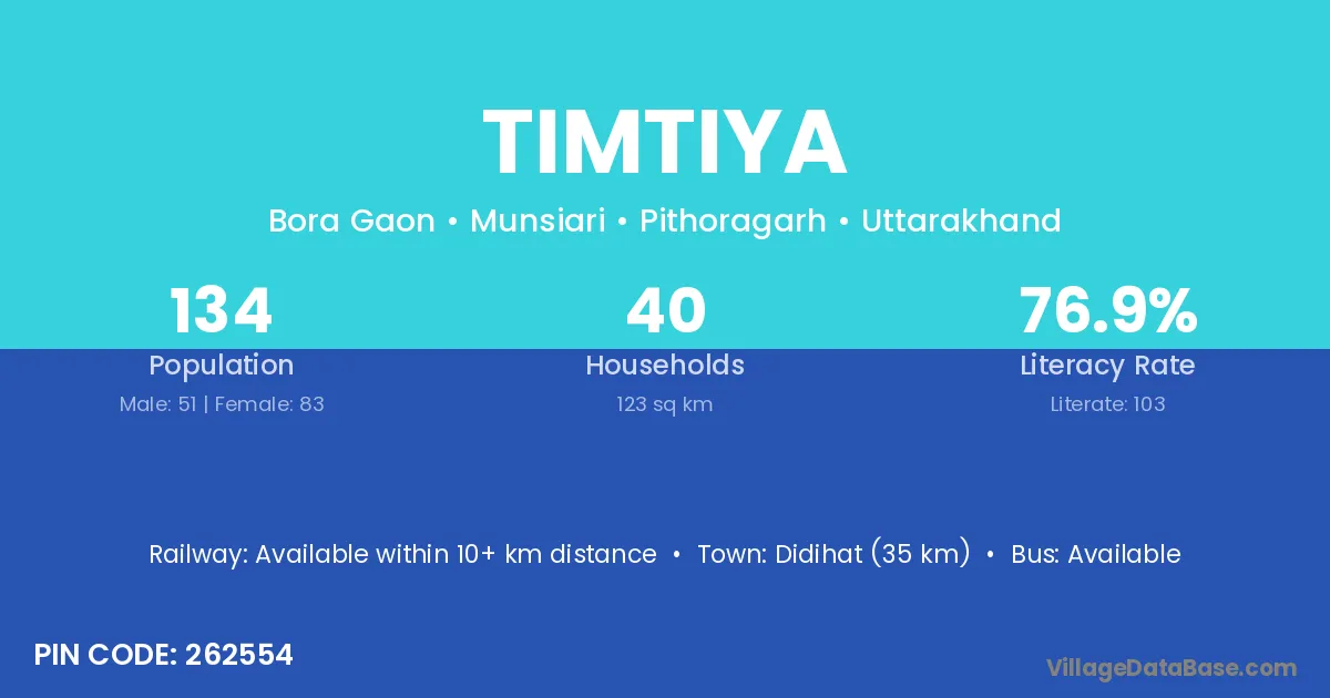 Didihat (35 km) is the nearest town to Timtiya village for major economic activities and is located approximately 35 km away.