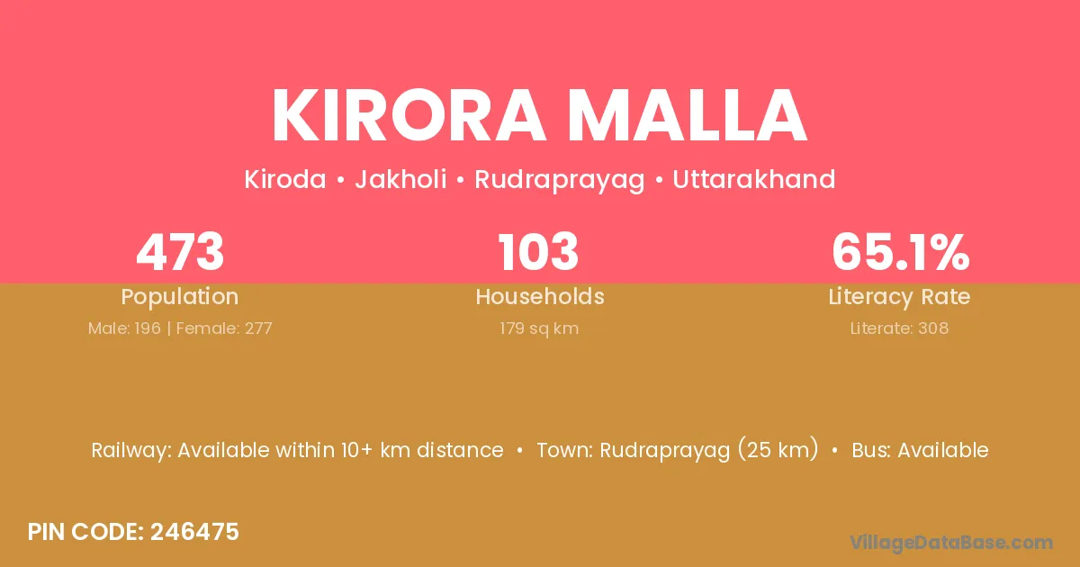 Rudraprayag (25 km) is the nearest town to Kirora Malla village for major economic activities and is located approximately 25 km away.