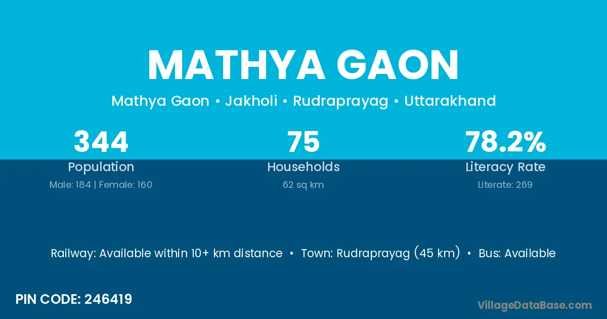 Rudraprayag (45 km) is the nearest town to Mathya Gaon village for major economic activities and is located approximately 45 km away.