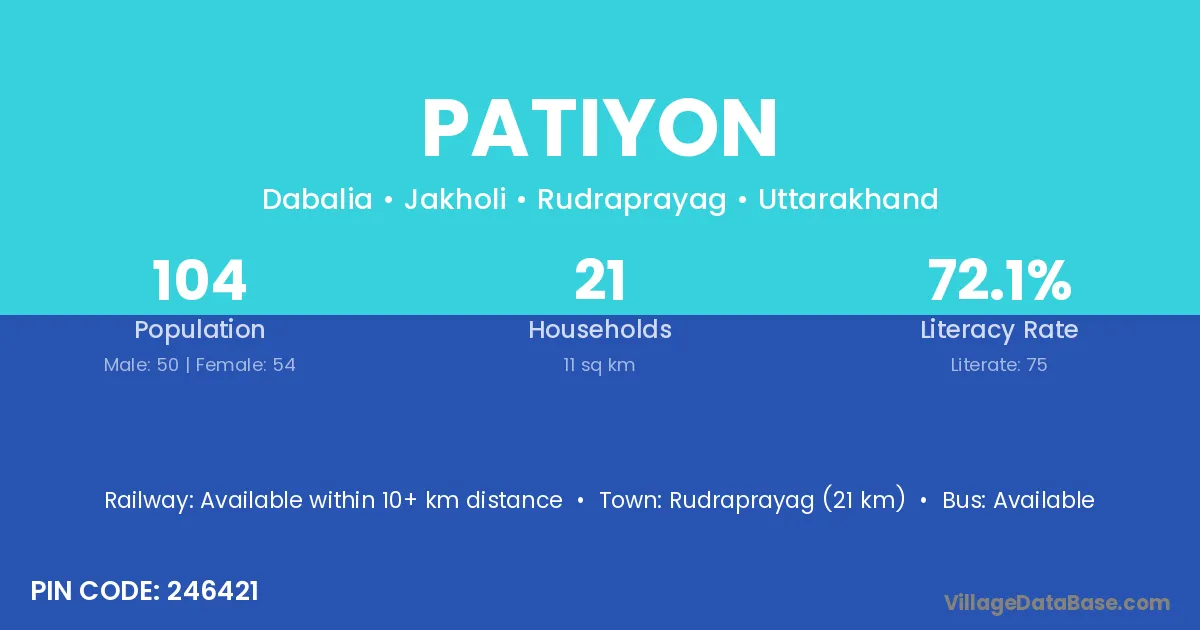 Rudraprayag (21 km) is the nearest town to Patiyon village for major economic activities and is located approximately 21 km away.