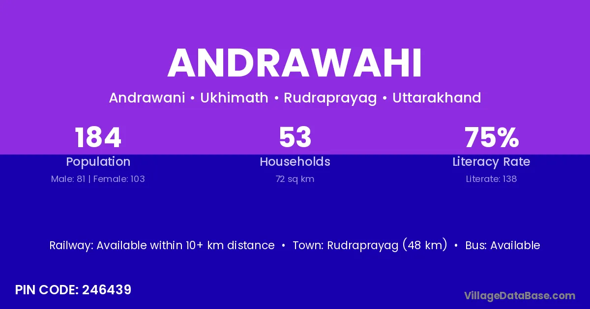 Rudraprayag (48 km) is the nearest town to Andrawahi village for major economic activities and is located approximately 48 km away.