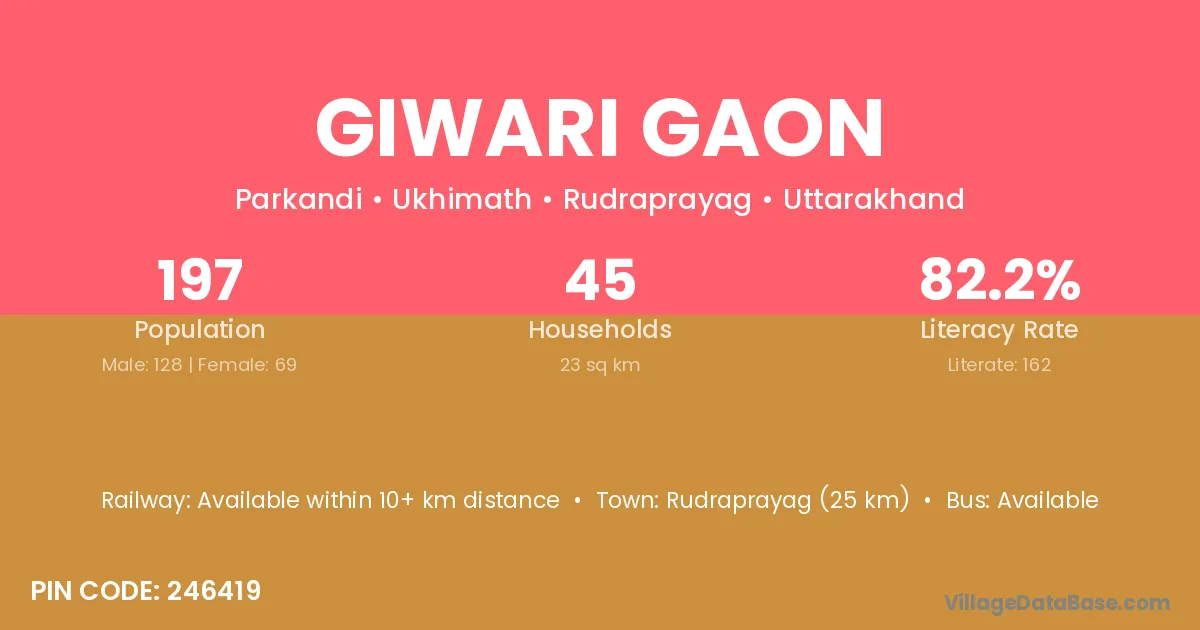 Rudraprayag (25 km) is the nearest town to Giwari Gaon village for major economic activities and is located approximately 25 km away.