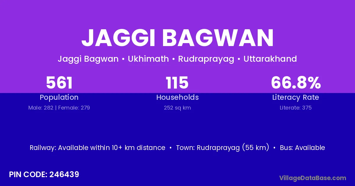 Rudraprayag (55 km) is the nearest town to Jaggi Bagwan village for major economic activities and is located approximately 55 km away.