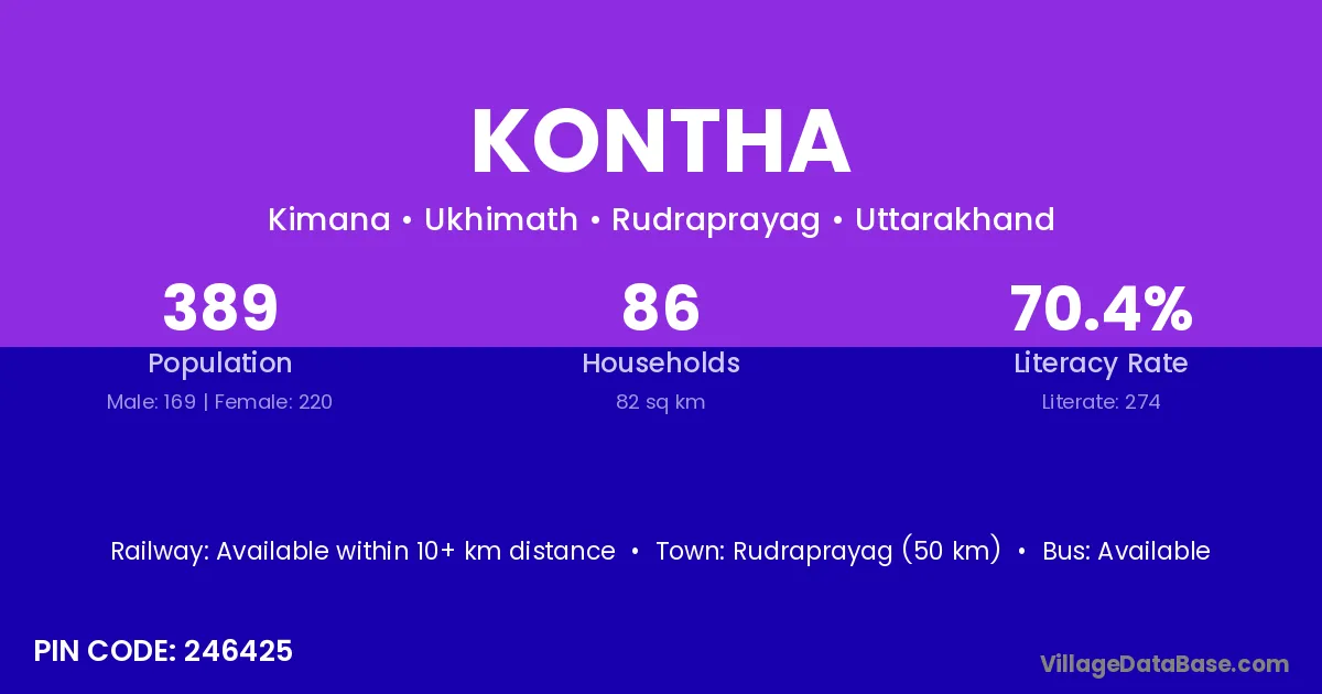 Rudraprayag (50 km) is the nearest town to Kontha village for major economic activities and is located approximately 50 km away.