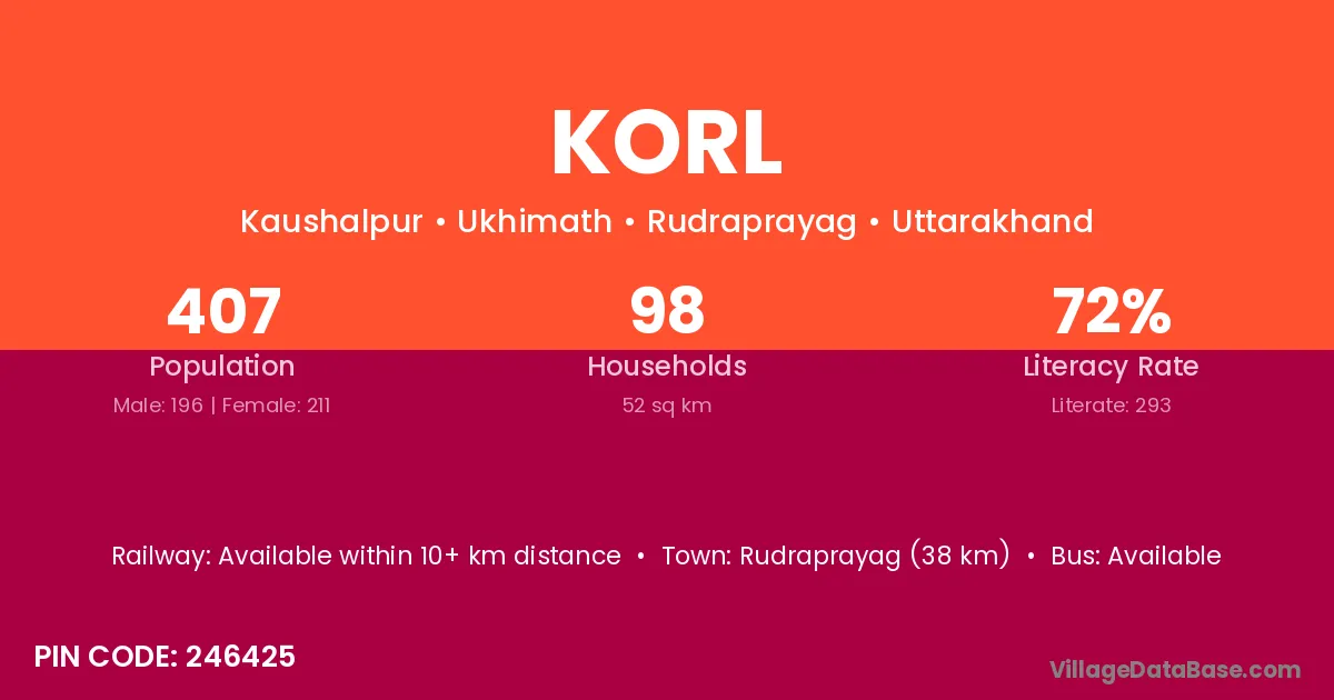 Rudraprayag (38 km) is the nearest town to Korl village for major economic activities and is located approximately 38 km away.