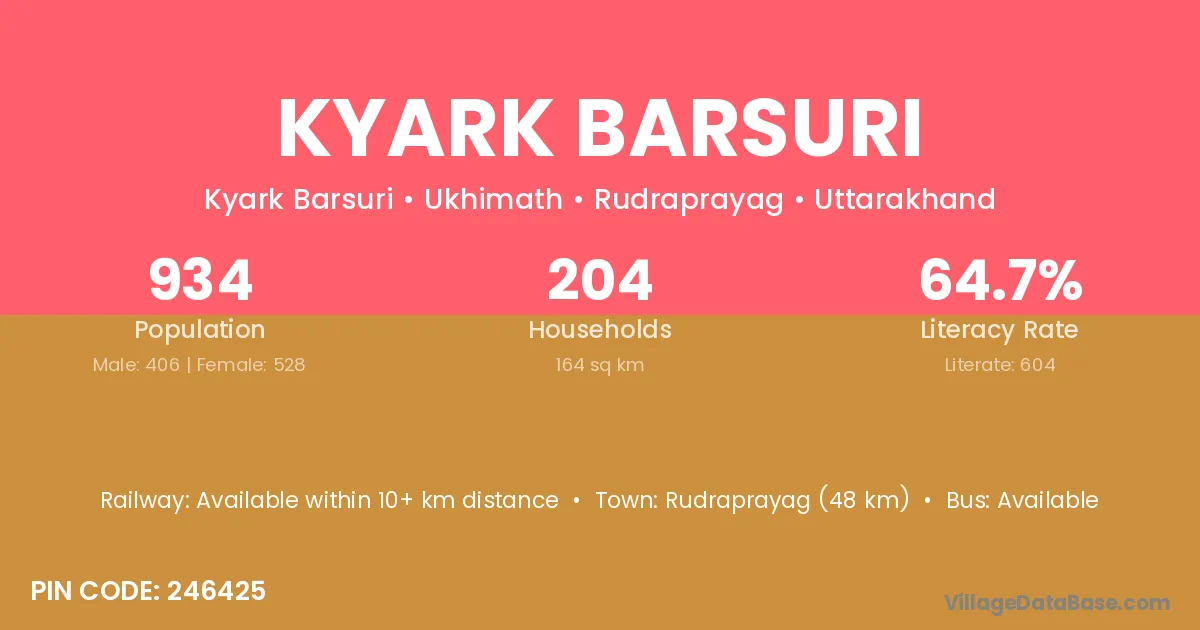 Rudraprayag (48 km) is the nearest town to Kyark Barsuri village for major economic activities and is located approximately 48 km away.