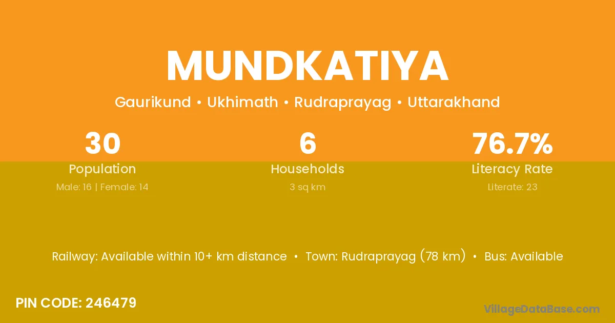 Rudraprayag (78 km) is the nearest town to Mundkatiya village for major economic activities and is located approximately 78 km away.
