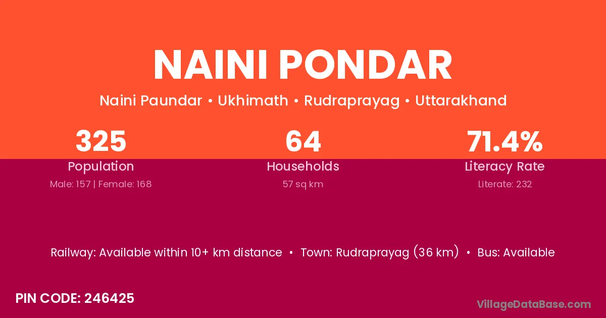 Rudraprayag (36 km) is the nearest town to Naini Pondar village for major economic activities and is located approximately 36 km away.