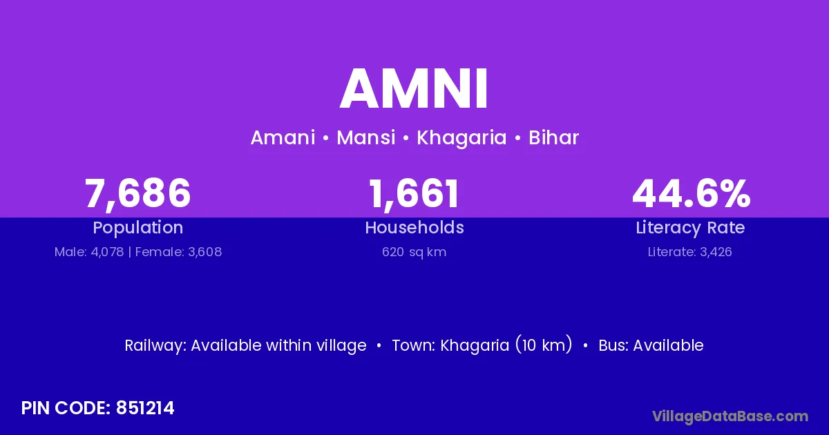 The literacy rate of Amni village is 66.08%. Male literacy stands at 79.63% and female literacy at 53.78%.