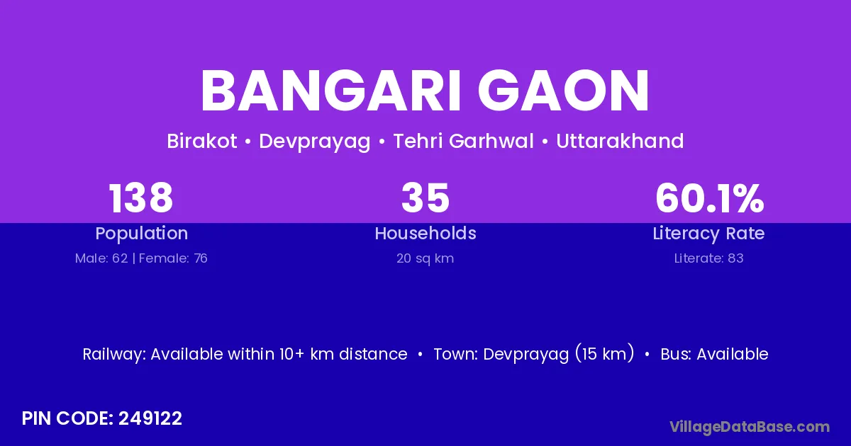 Devprayag (15 km) is the nearest town to Bangari Gaon village for major economic activities and is located approximately 15 km away.
