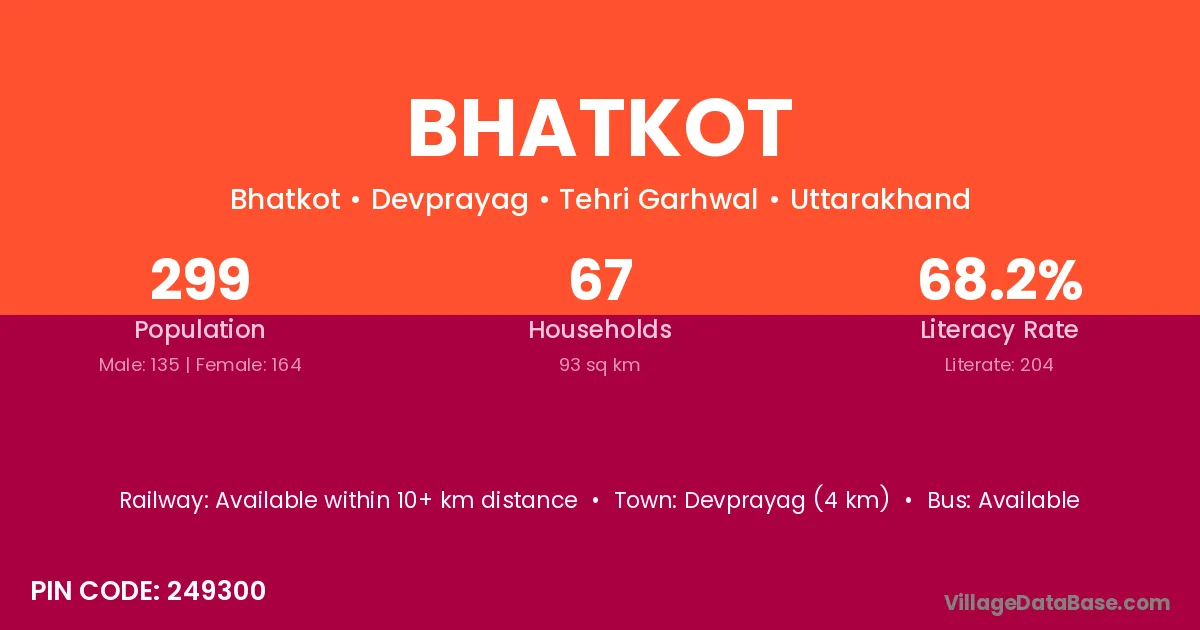 Devprayag (4 km) is the nearest town to Bhatkot village for major economic activities and is located approximately 4 km away.