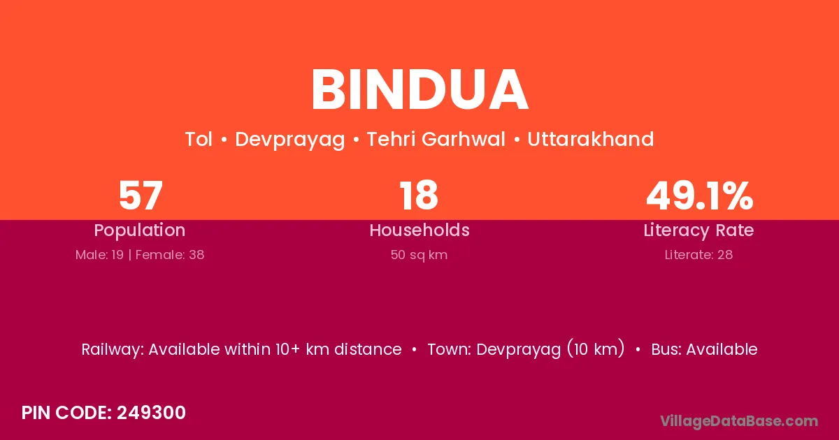 Devprayag (10 km) is the nearest town to Bindua village for major economic activities and is located approximately 10 km away.