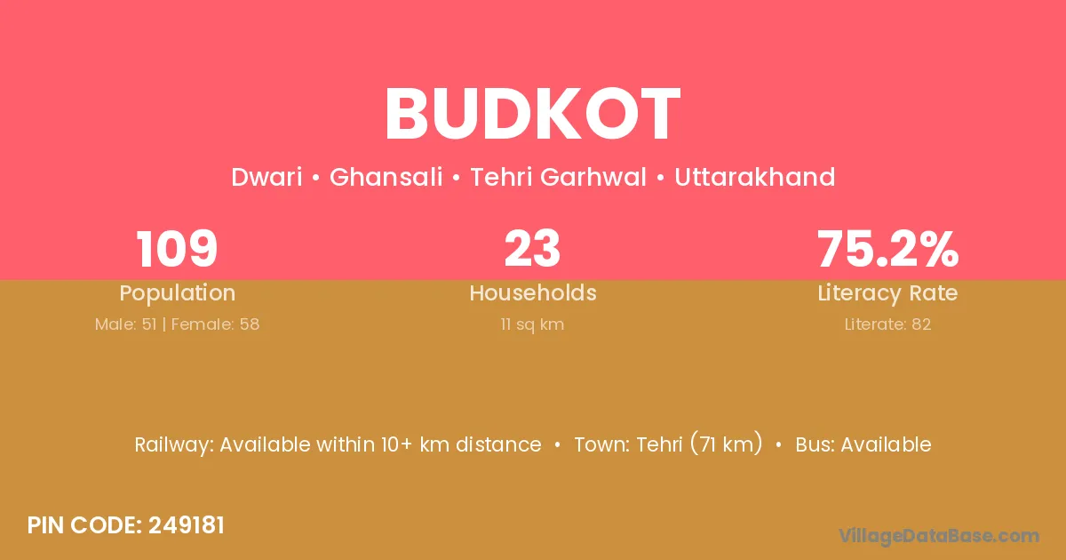 Devprayag (30 km) is the nearest town to Budkot village for major economic activities and is located approximately 30 km away.