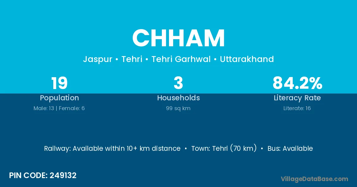 Devprayag (18 km) is the nearest town to Chham village for major economic activities and is located approximately 18 km away.