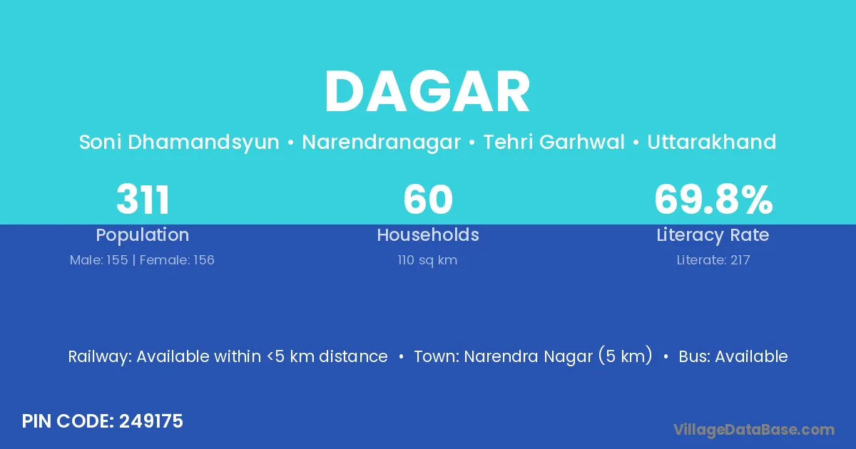 Srinagar (35 km) is the nearest town to Dagar village for major economic activities and is located approximately 35 km away.