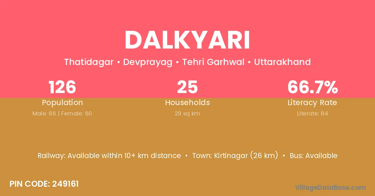 Kirtinagar (26 km) is the nearest town to Dalkyari village for major economic activities and is located approximately 26 km away.