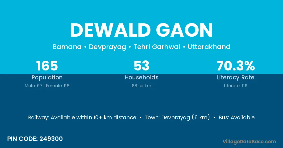 Devprayag (6 km) is the nearest town to Dewald Gaon village for major economic activities and is located approximately 6 km away.