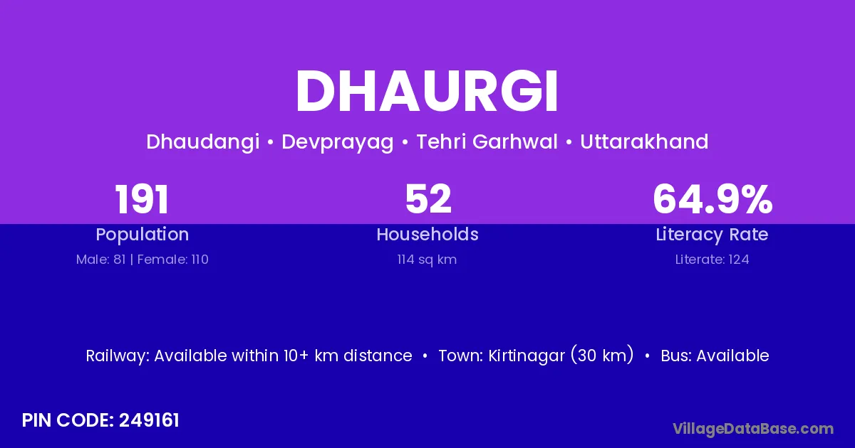 Kirtinagar (30 km) is the nearest town to Dhaurgi village for major economic activities and is located approximately 30 km away.